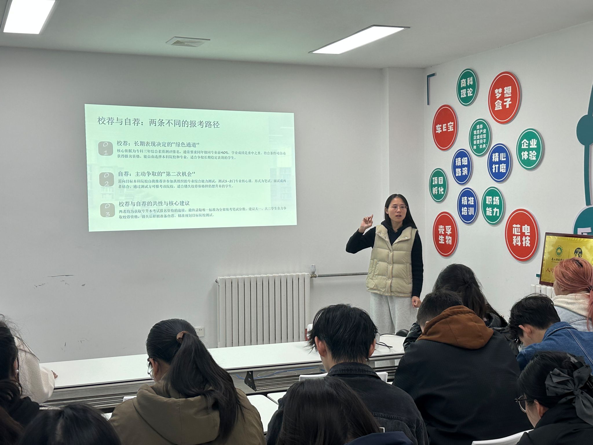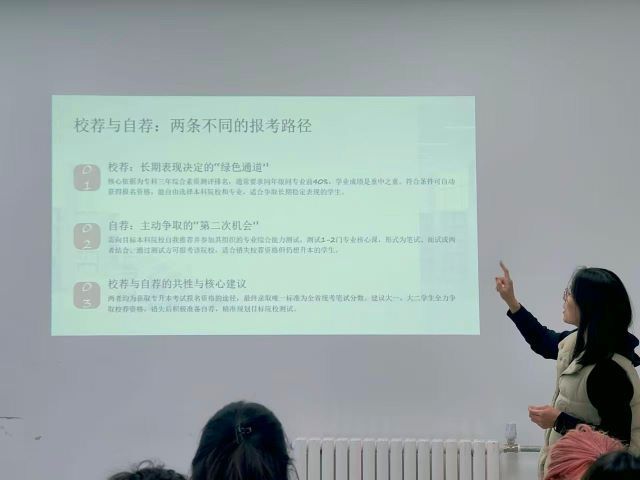 活动伊始,黄晓老师便直击考生备考痛点,对“校荐生”与“自荐生”进行了清晰解读。她指出,二者最根本的区别在于资格获取途径。“校荐生”资格主要由专科院校根据学生综合测评成绩排名进行推荐;而“自荐生”则需通过自主报名参加本科院校组织的专业综合能力测试。她总结道,“无论哪条路径,都为大家敞开了通往本科的大门,关键在于明确自身定位,选择最适合自己的赛道,并提前做好相应准备。”黄晓老师通过两者的比较,帮助同学们更好地认识专升本政策,明确努力方向。