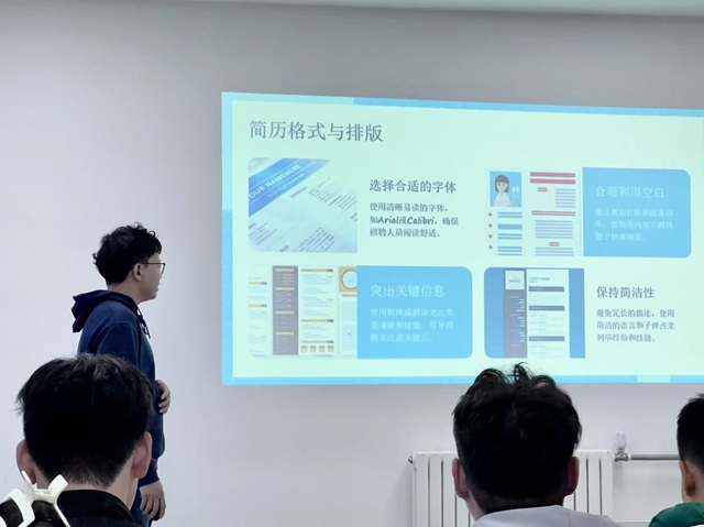 随后,张凡老师围绕“职场核心竞争力的构建”展开分享。结合多年招聘实战经验,他从简历优化、面试技巧、职场沟通三大核心维度,用生动的案例拆解职场“加分秘籍”,以深入浅出的讲解剖析了简历的构成,他特别强调,简历需突出个人优势,例如通过量化成就展示实际贡献。