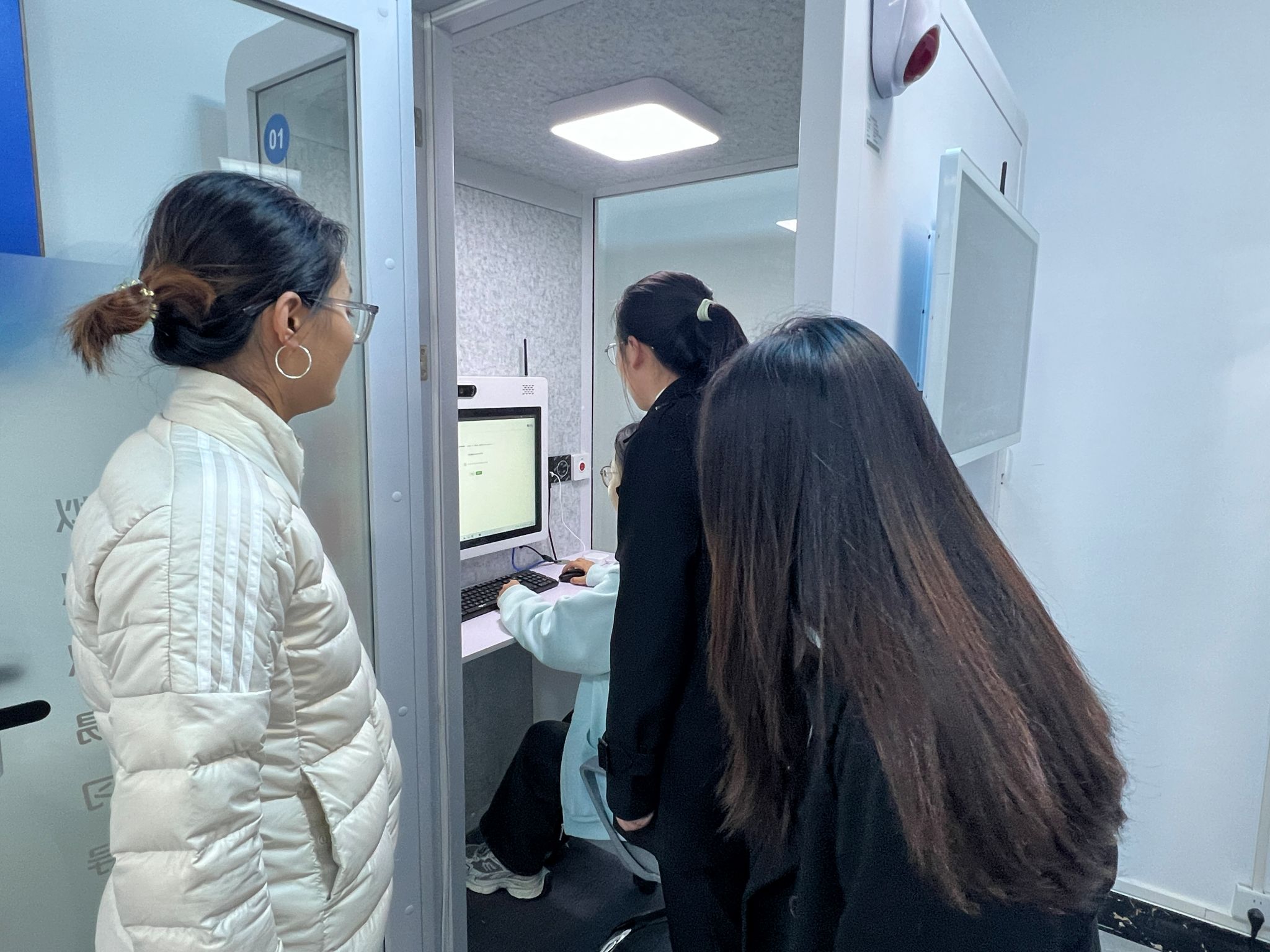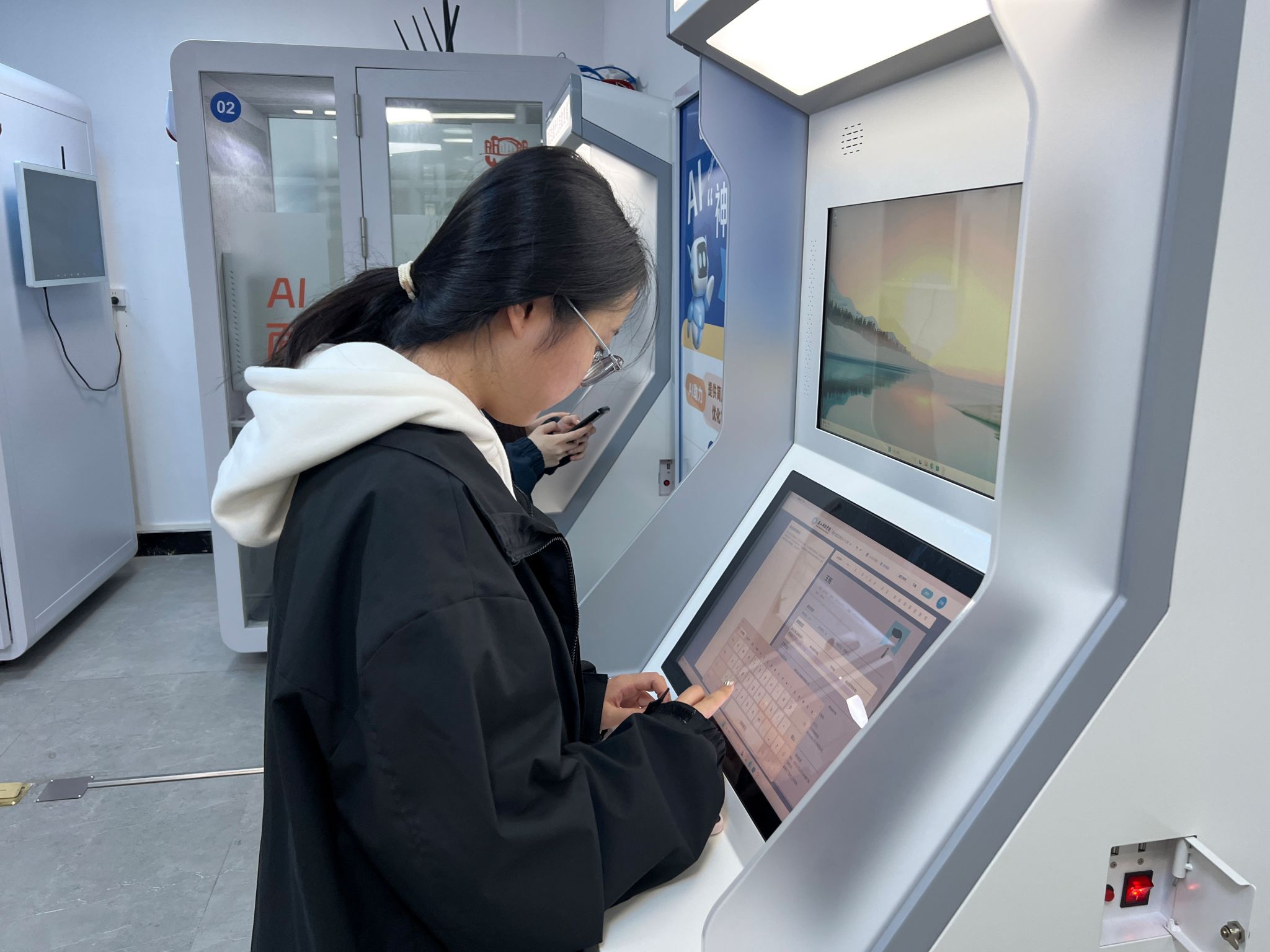 紧接着,学生们体验了更具挑战性的“AI模拟面试舱”。在这个私密的空间内,学生们面对的不再是老师和同学,而是一位由人工智能驱动的“面试官”。这位“面试官”能够根据学生选择的行业、职位,提出高度仿真的专业问题和情景化题目。