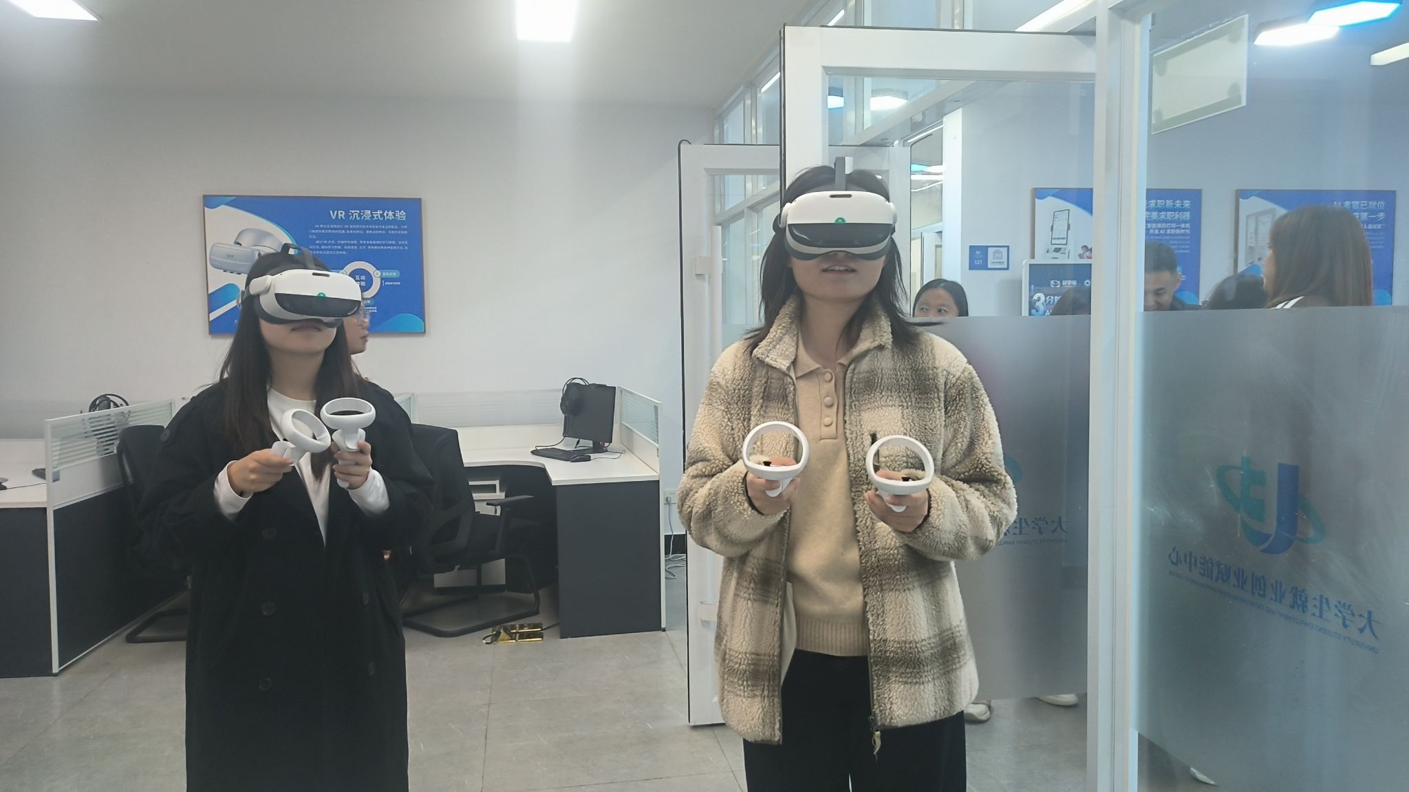 活动的第三站来到了充满科技感的“VR面试专区”。学生们佩戴上VR设备,瞬间“置身”于各种逼真的面试场景之中——可能是庄重严肃的会议室,也可能是轻松开放的创意空间,甚至是应对群体面试的无领导小组讨论现场。