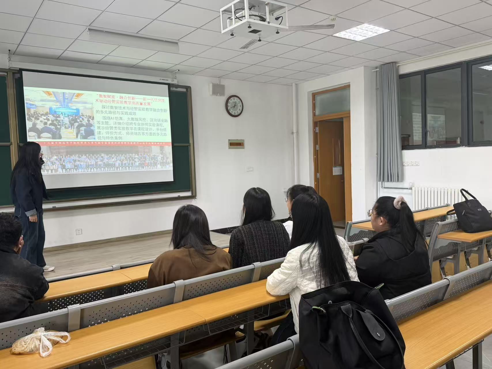 会议伊始,徐营营老师传达了第二十六届全国高等学校经管类专业实验室建设研讨会的核心精神。她重点解读了“数智赋能・融合创新——新一代信息技术驱动经管实验教学高质量发展”的会议主题,详细介绍了会上分享的AI仿真、大数据风控、区块链金融等前沿领域实验教学实践案例,并结合教育部高教司课程教材与实验室处处长刘永强关于“通过体系化重塑、数智化赋能、跨业融合发展补齐实验教学短板,实现理论与实践双轮驱动”的讲话要求,强调教研室需紧跟数智化教学趋势,推动实验教学改革落地。