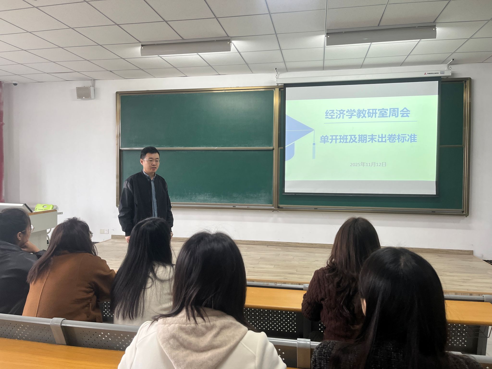 为严格落实学校教学质量要求,规范单开班与16周课程试卷命题标准,确保试卷的科学性、应用型与规范性,切实发挥考试对教学的检验与导向作用,近11月12日经济学教研室召开出题规则专题学习会。会议由教研室主任聂飞主持,全体教师围绕试卷考查范围、题型设计、分值设定、应用型体现等核心要求展开深入学习与交流,为高质量命题工作筑牢基础。