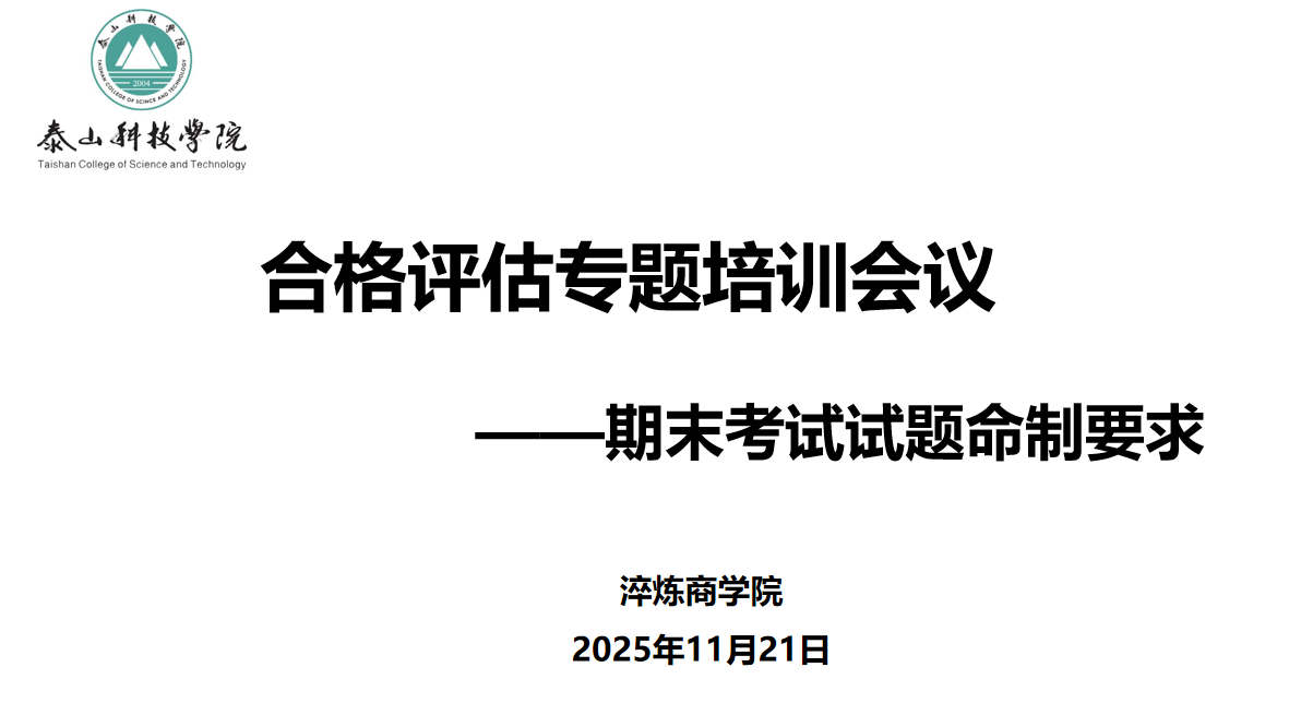为全面落实本科教学合格评估要求,进一步规范期末考试试题命制流程,提升命题质量与教学评价科学性,2025年11月21日,泰山科技学院淬炼商学院组织召开合格评估专题培训会议,学院全体教师参会。