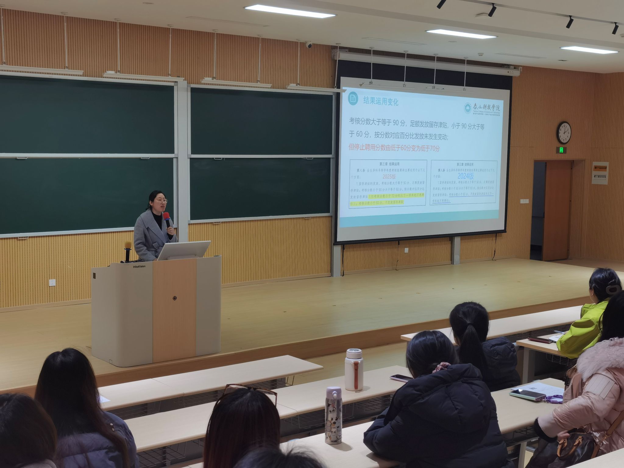 会上,鹿敏院长围绕考核办法的核心变化进行解读。基础运行板块新增多项考核指标,优化部分指标赋分规则,既强化了互动陪伴、专项工作、生涯指导等核心职责的考核,也新增了学风建设、自护教育、学校声望传播等相关内容,更全面地覆盖学生成长需求。创新拓展与加分项目方面,部分指标赋分标准进一步优化,更注重工作实效与实践价值。结果运用上,留存津贴发放规则保持稳定,同时将停止聘用分数线适当提高,进一步严格导师队伍准入与退出机制,确保导师队伍整体素质。此外,考核结果仍与职称评定、评优评先等直接挂钩,学校将持续为导师提供资源支持与能力培训,助力导师更好开展工作。