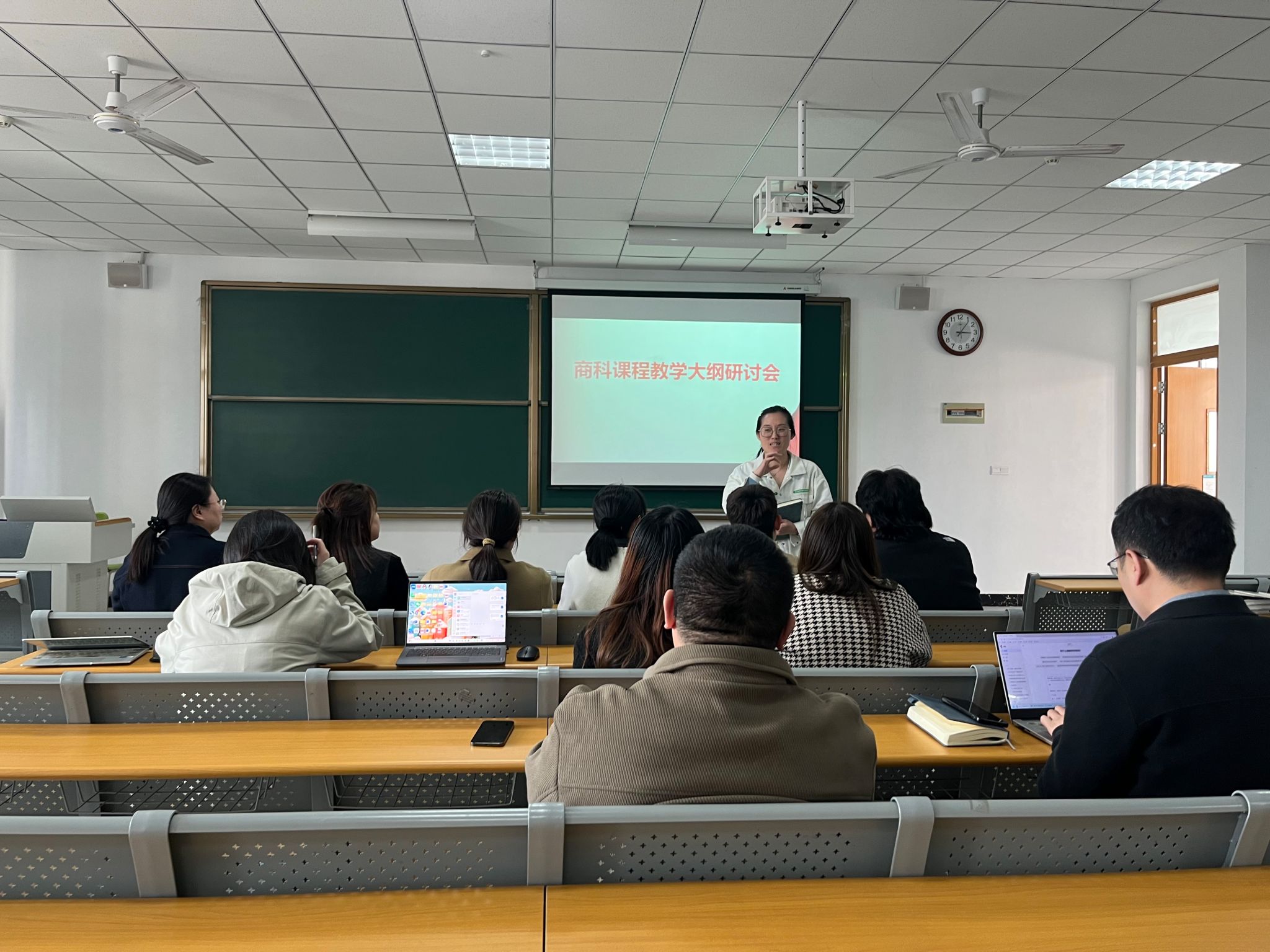 在教学大纲完善环节,各课程负责人就课程目标、教学内容安排、重点难点分布等进行了再次逐项梳理。针对案例融入课堂、跨课程知识点的重复等共性难点,大家集思广益,分享了各自的教学经验与改进思路。通过深度交流,各课程进一步明确了教学边界与协同关系,有效推动了课程体系的系统化与科学化。会议最后,教研室就2025-2026学年第二学期商科课程学情调查工作作了简要安排。