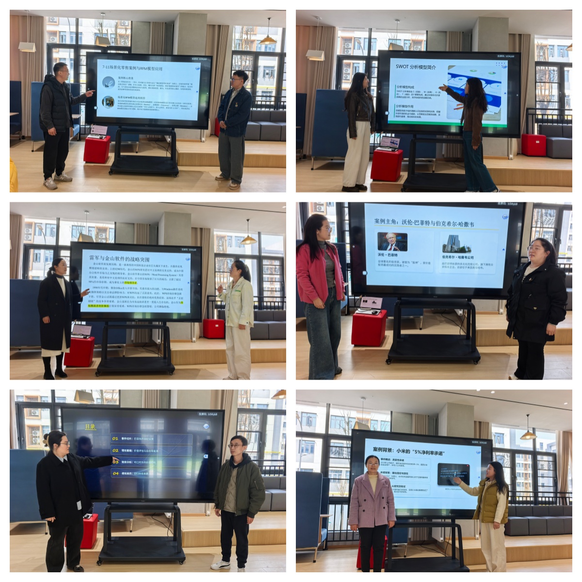本次研讨会创新性地采用了“切片陈述”的研讨模式。同一学科背景的教师,2人一组使用各自学科的核心理论工具,对大咖传记中的单一商业事件进行“切片式”分析。在分析《雷军传》中,小米“5%净利率承诺”时,财务管理教研室的刘隽婕和庄倩老师运用财务比率与杜邦分析法,从盈利模式与现金流视角解读其战略本质;在剖析《巴菲特传》中投资可口可乐的决策时,经济学教研室的林育瑾和戴玮老师则运用价值投资与自由现金流折现模型,揭示其内在价值逻辑;企业管理教研室的苏适和张成老师则运用了战略管理中的经典模型——SWOT矩阵模型,系统评估了《马云传》中阿里云的早期投资决策及其战略选择的优势与弱势。