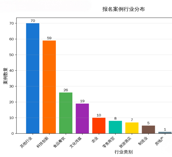 本次报名案例涵盖12个主要行业,形成以科技创新为引领、多行业协同发展的格局。其中,科技创新行业贡献59个案例,占比28.37%,成为最大参赛群体,体现了数字化转型背景下科技企业品牌营销需求的快速增长。食品餐饮行业(26个案例,12.50%)和文化传媒行业(19个案例,9.13%)表现突出,反映了传统行业对品牌升级的迫切需求。农业相关案例共10个(4.81%),标志着农业企业品牌化进程加速。此外,零售商贸、旅游酒店、制造业等行业均有参与,体现了大赛对全行业品牌营销能力提升的促进作用。