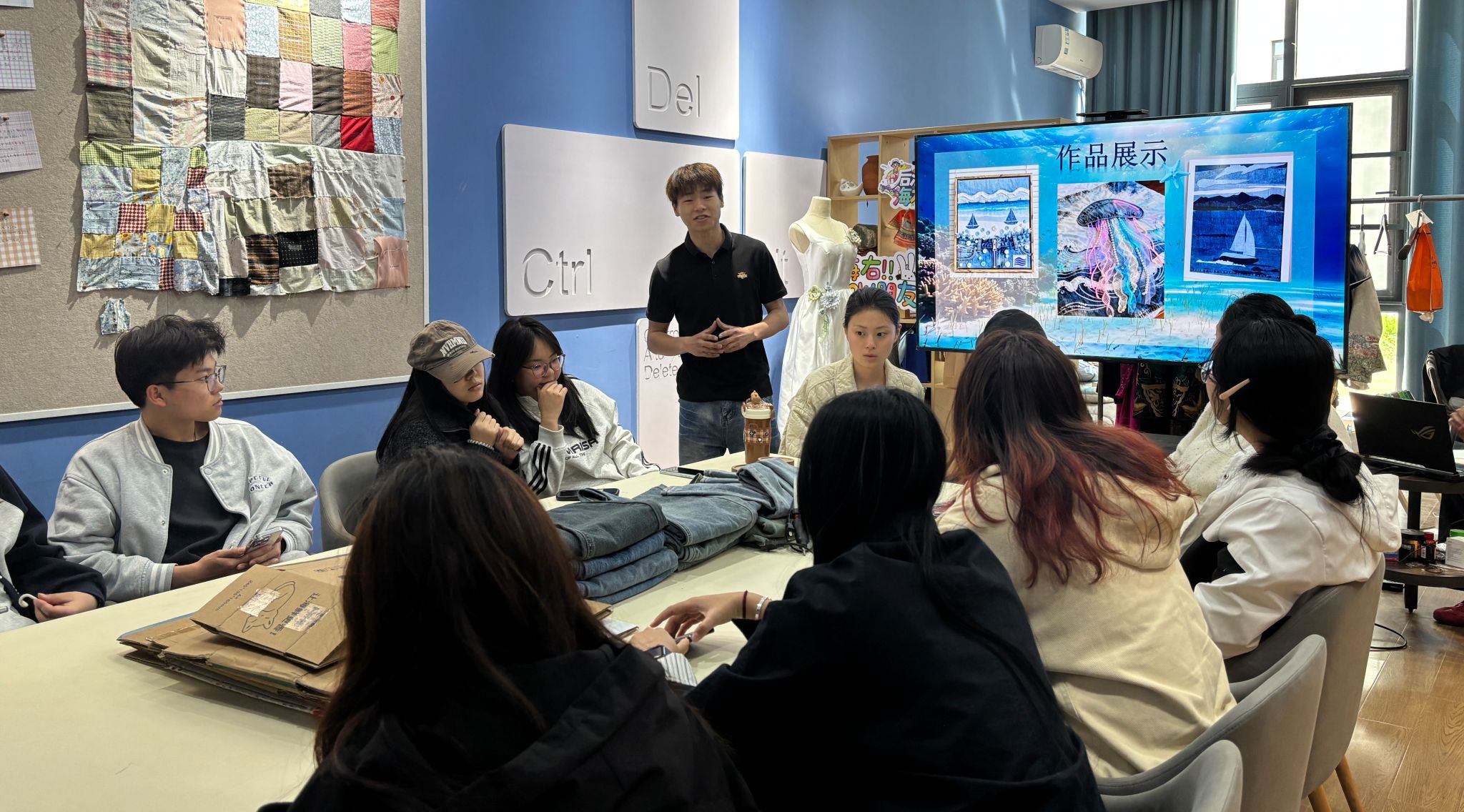 创作环节中,同学们以旧牛仔为原料,剪裁拼贴出鲸鱼、海星、海浪等海洋主题作品,将闲置物料转化为文创产品雏形。大家在协作创作中交流创意,既提升动手能力,也学习物料整合、创意变现等商科思维,让旧物改造兼具艺术价值与商业潜力。