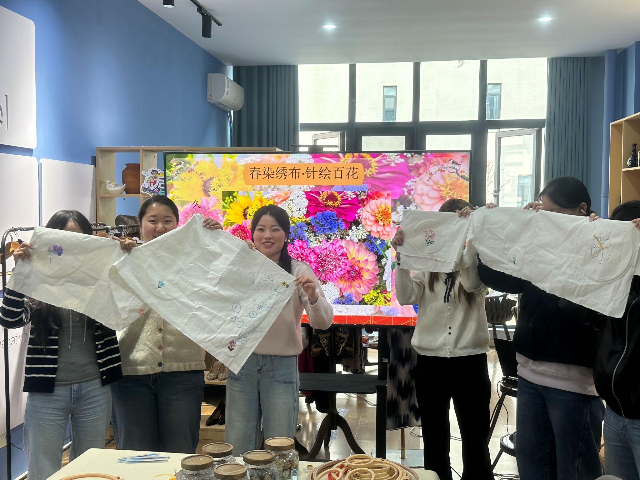 一花独放不是春,百花齐放春满园。为传承传统文化,丰富校园生活,3月27日,海右书院久屿华尚工坊“春染绣布・针绘百花”鲁绣集体创作活动温情启幕。本次活动由淬炼商学院王静媛老师全程指导,以“鲁绣+商科”融合为特色,将商科思维融入实践,九屿华尚工坊成员带领十名学生齐聚工坊,以针为笔、以线为墨,在白色绣布上共绣春日百花盛景。
