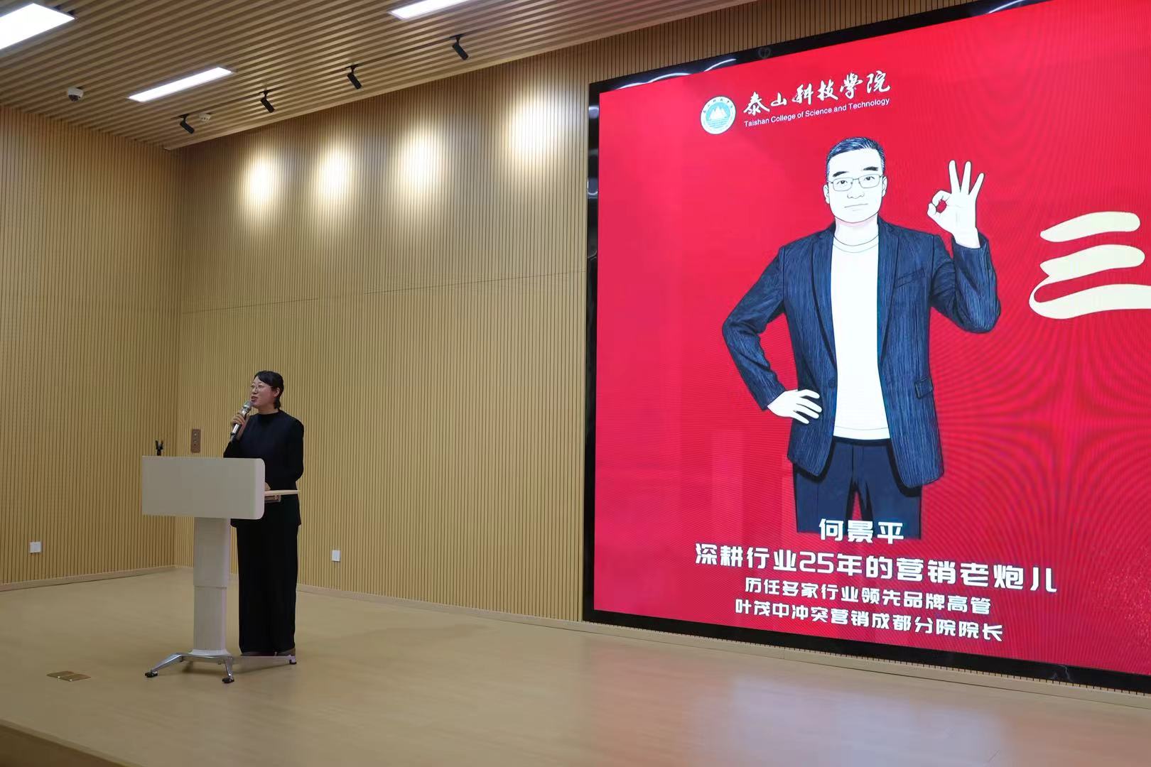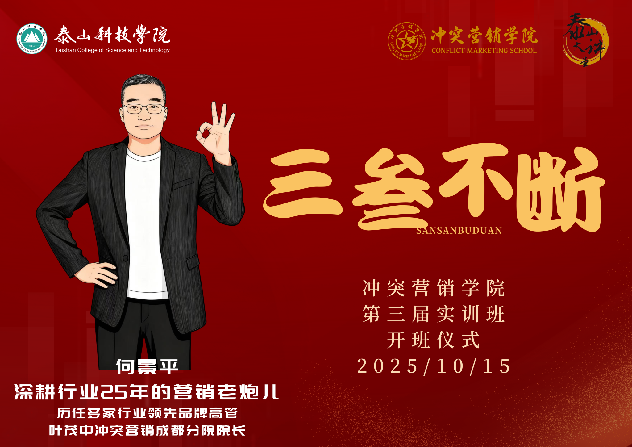 10 月 15 日下午,泰山科技学院冲突营销学院联合泰山大讲堂,共同举办 “冲突营销系列讲座” 第一期活动,同步开启 “三叁不断” 冲突营销学院第三届实训班。出席本次开班仪式的领导和嘉宾有:叶茂中冲突营销成都分院院长何景平先生以及泰山科技学院淬炼商学院(冲突营销学院)院长鹿敏教授。本次活动旨在搭建理论与实践融合的学习平台,助力学生深化营销专业认知,300 余名市场营销及相关专业学生现场参与,气氛热烈。