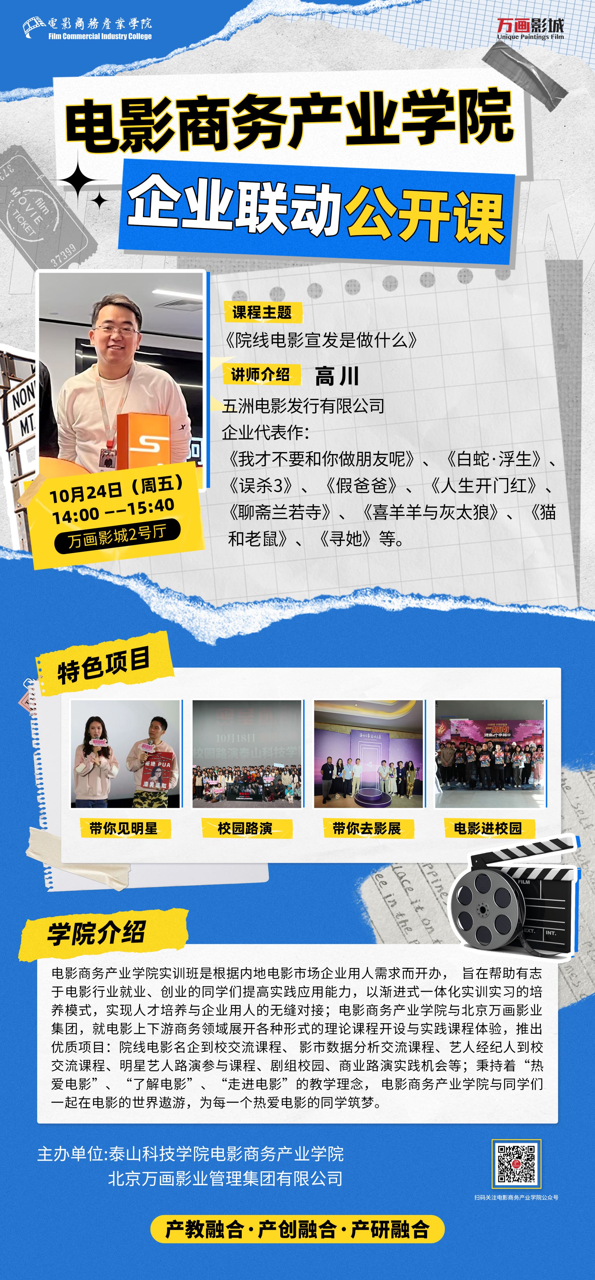 为进一步深化产教融合,推动电影商务专业人才培养与行业实务深度衔接,10月24日,电影商务产业学院特邀资深电影宣发专家、企业导师高川莅临授课,以《电影宣发是做什么》为主题,围绕线下影院阵地推广这一核心板块,为全院学子带来了一场兼具行业高度与实操价值的专业盛宴。