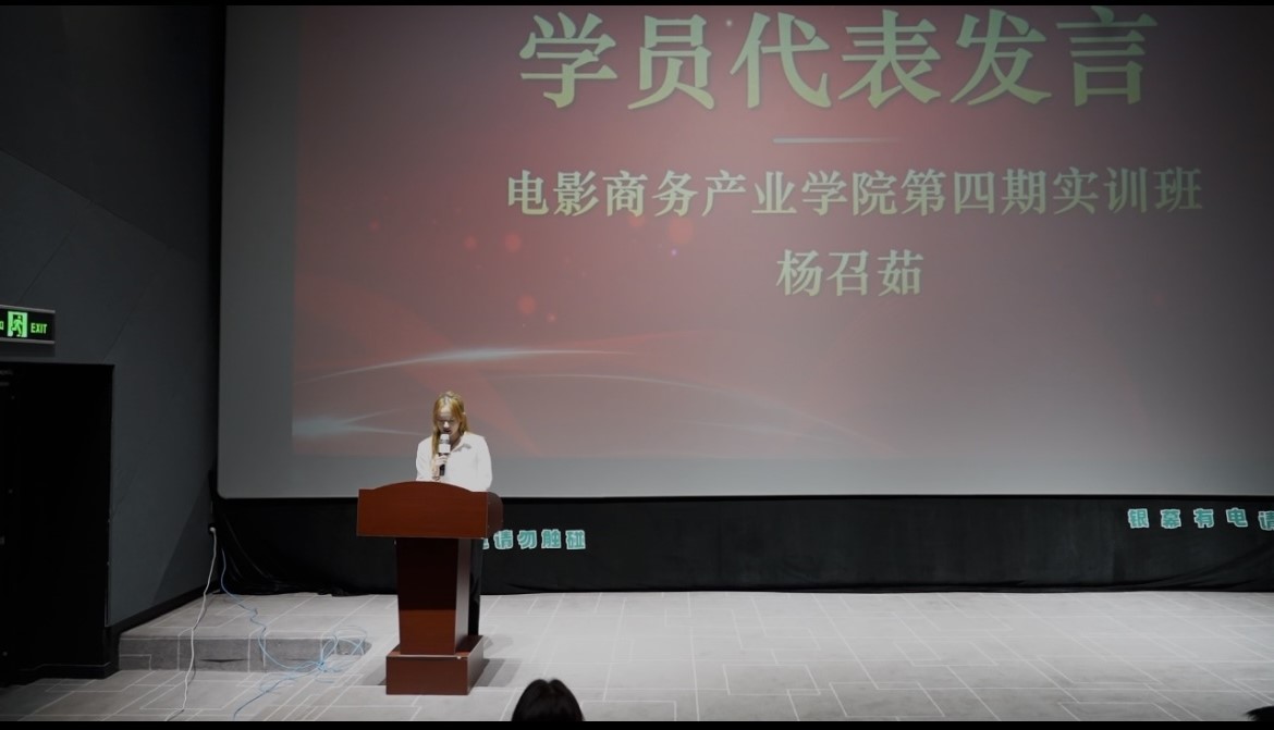 随后,第四期实训班学员代表杨召茹上台分享学习感悟。她结合自身在课程学习、项目实践中的经历,讲述了在电影商务策划、市场运营等方面的收获与成长,表达了对学院师资团队与实训平台的由衷感谢,并展望了今后在行业内深耕发展的决心。