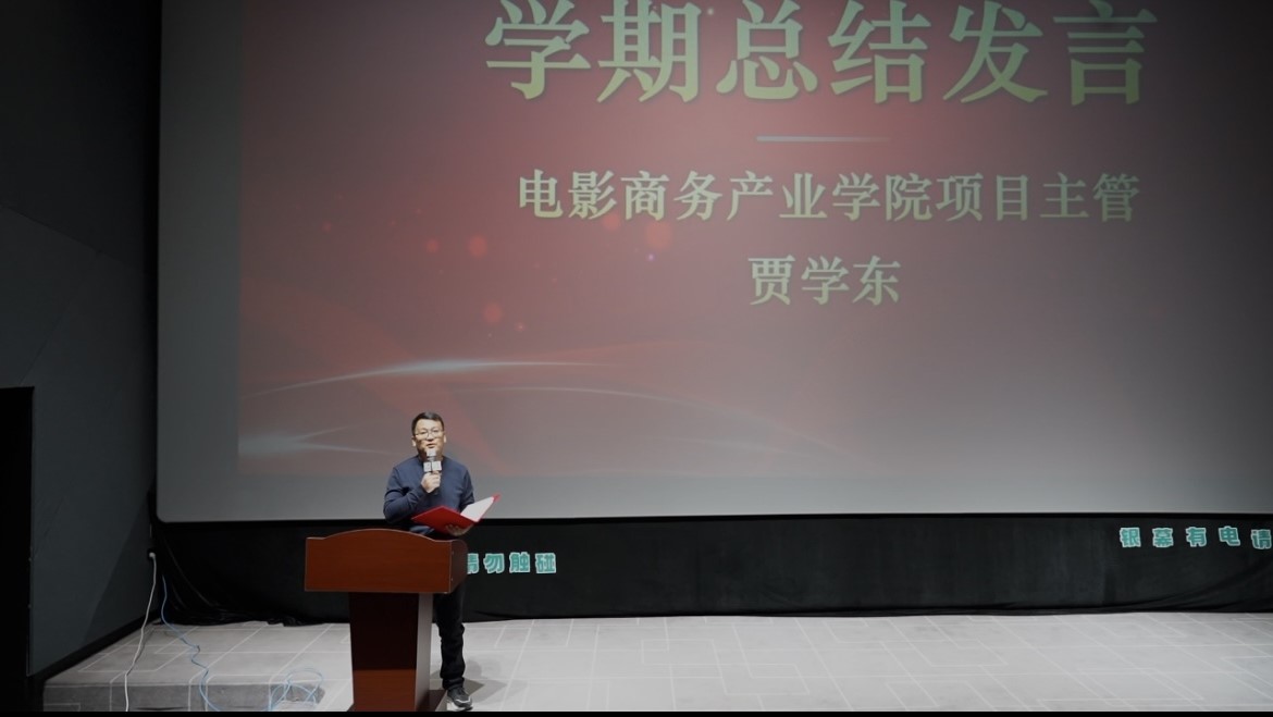 电影商务产业学院项目主管贾学东作实训总结发言。他对本期学员的整体表现给予高度评价,并强调学院将持续推进产教融合与校企合作,助力学员衔接行业、实现价值。贾主管鼓励大家以结业为新的起点,不断学习、勇于实践,在电影商务领域开拓更广阔的天地。
