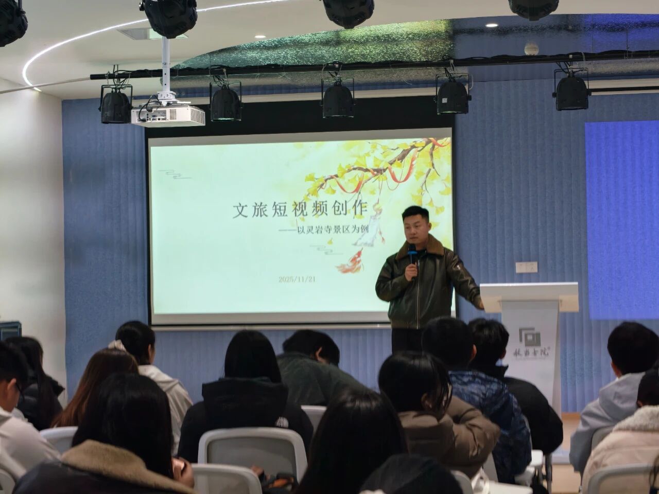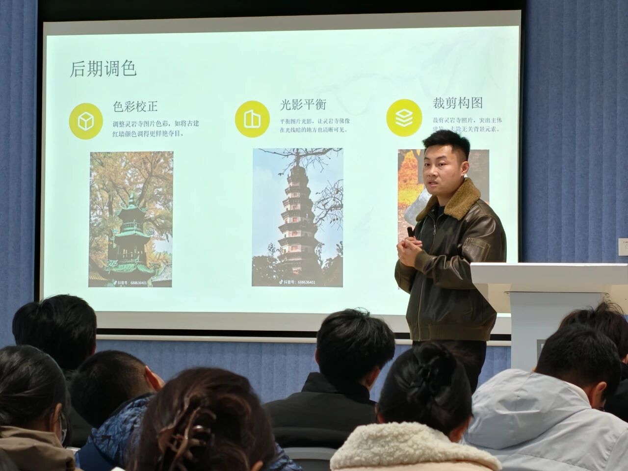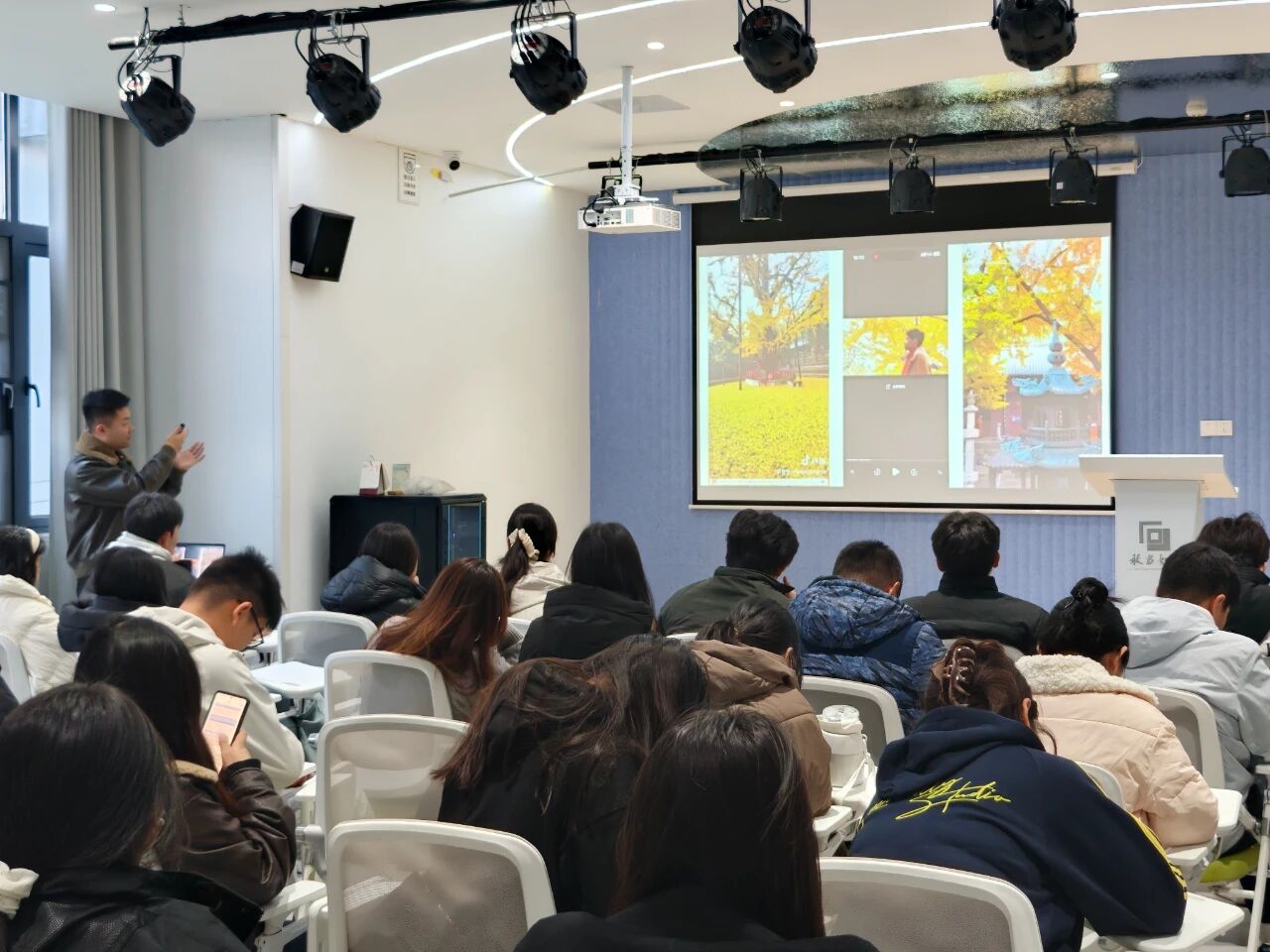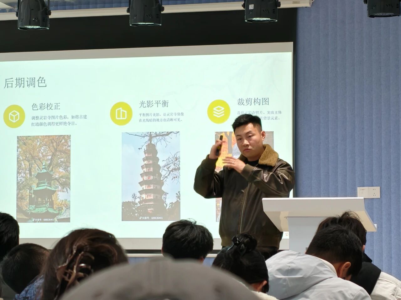 为帮助学子在灵岩寺研学实践中精准捕捉古建韵味与文化内涵,酒店商务产业学院“文旅短视频创作”专项培训课程在敢当书院205教室圆满结束。本次课程由薛明豪老师主讲,参与灵岩寺研学的学生齐聚课堂,系统解锁短视频拍摄与创作核心技能,为即将到来的实地研学做好充分准备。