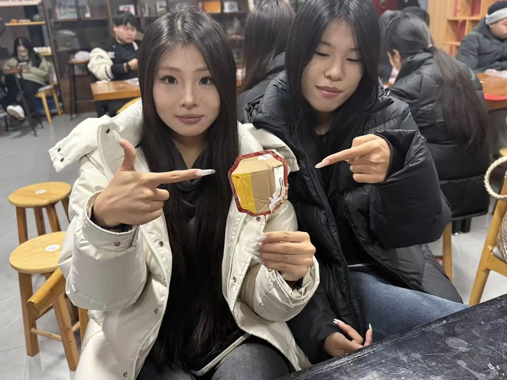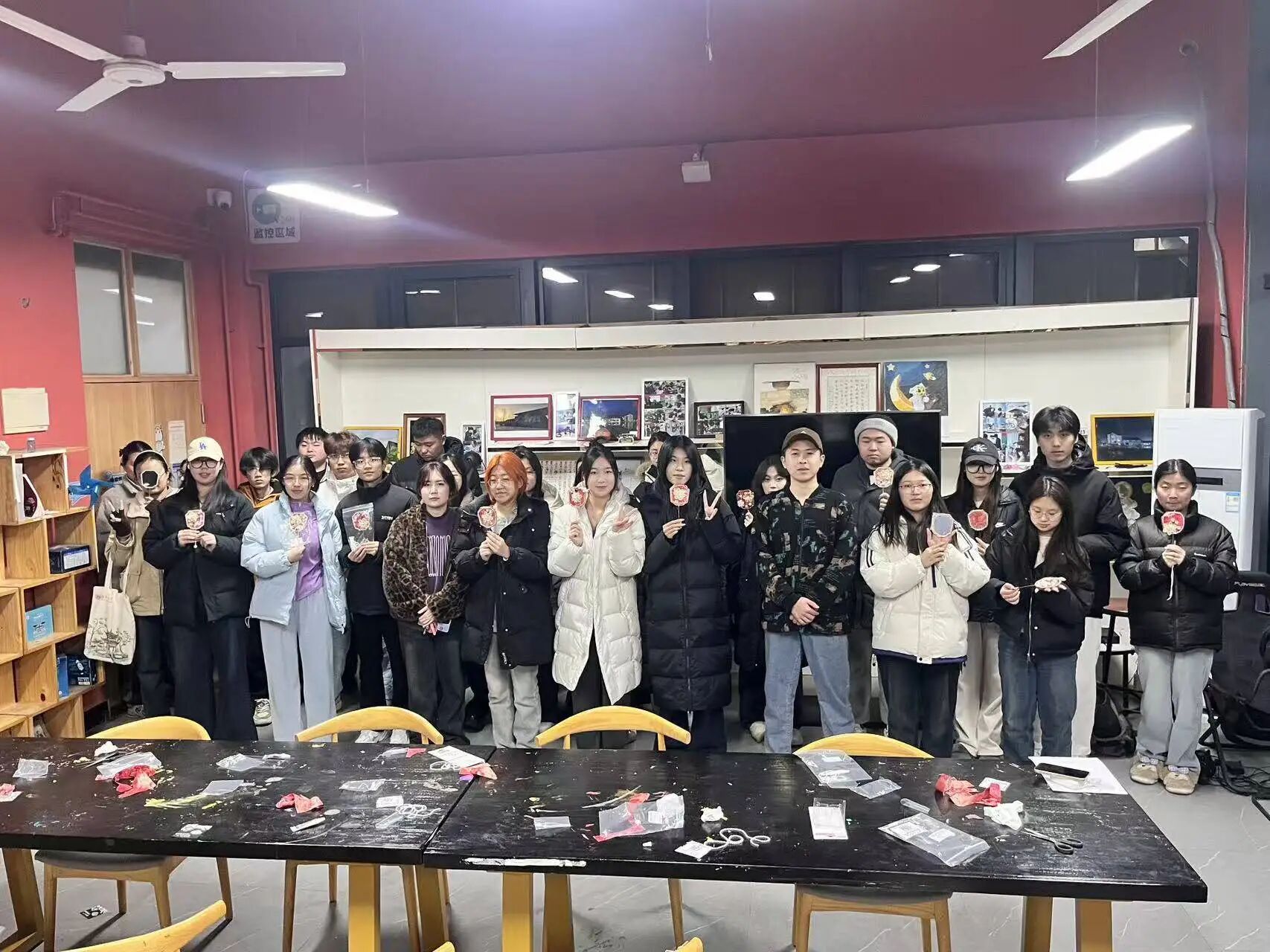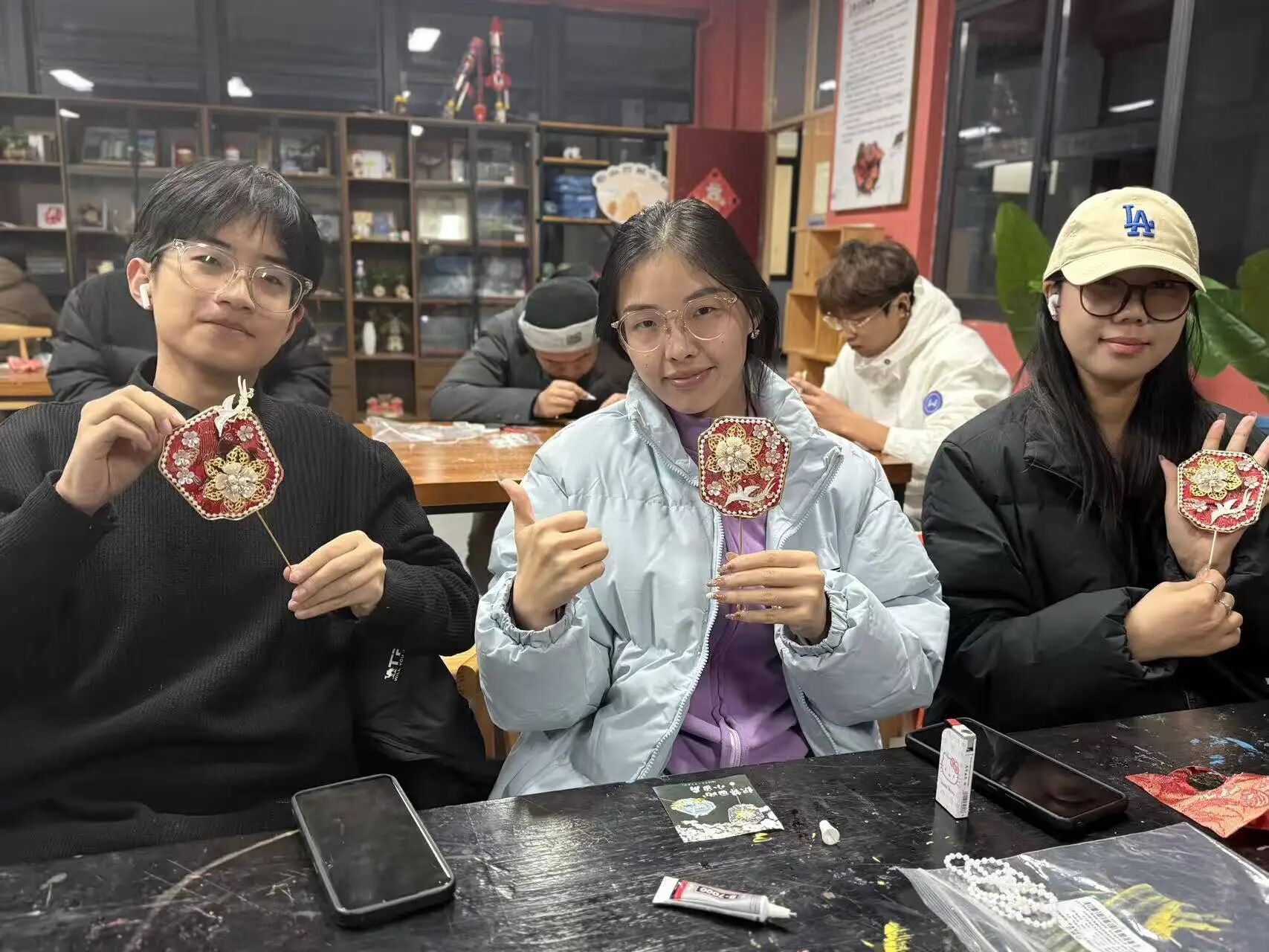 完成制作后,学员们捧着自己的作品,脸上满是喜悦,纷纷聚在一起展示交流:有人举着团扇对着光线欣赏配饰的光泽,有人互相展示扇面的设计巧思,还有人拿着作品合影留念,将这份亲手创作的美好定格。