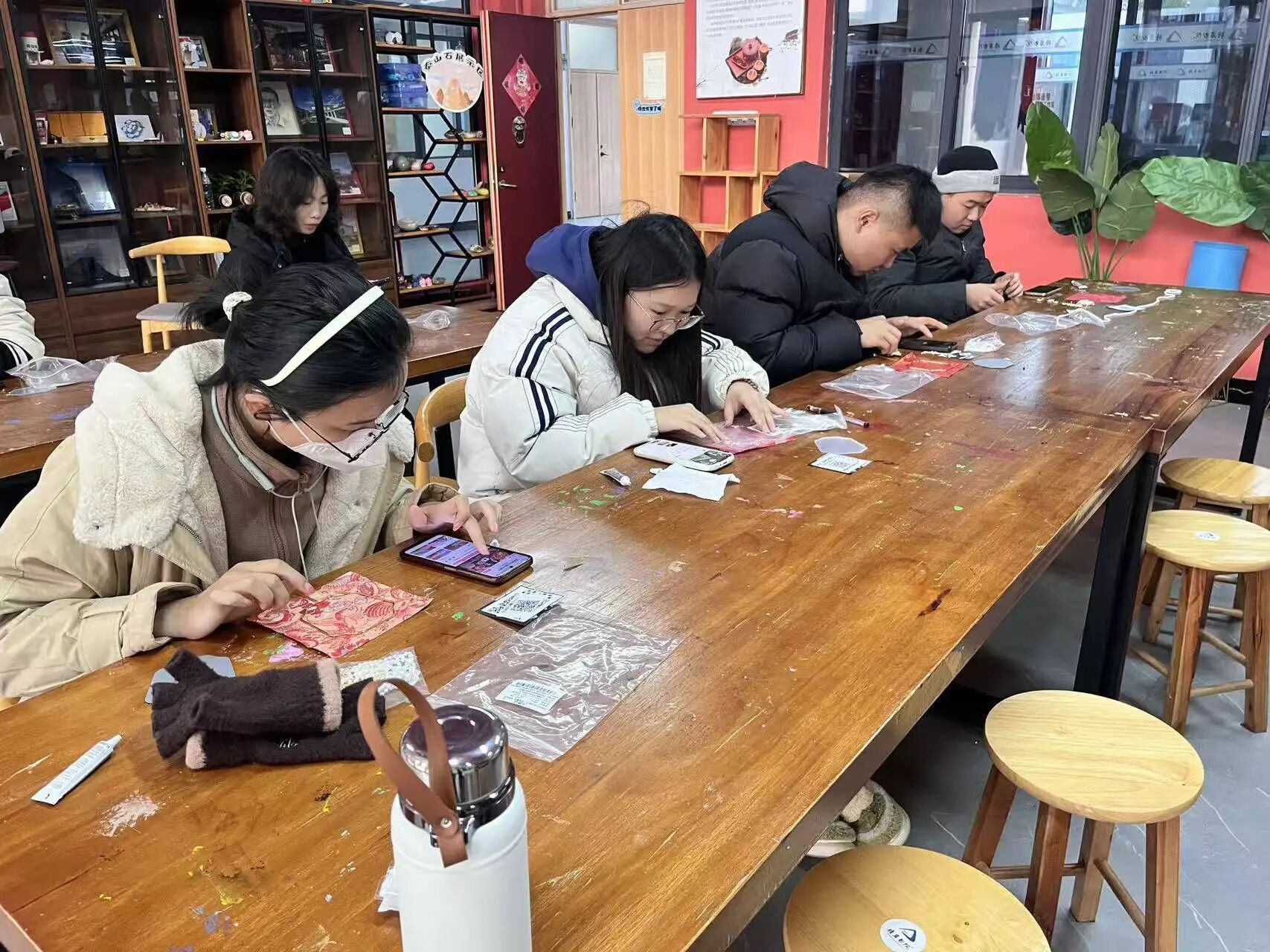 2025年12月19日下午,酒店商务产业学院组织实训班学员,开展镜面团扇手做实践活动,以传统手作实践为切入点,引导学员深度思考文旅文创产品的设计逻辑与市场价值。学员们已掌握文创手作的配饰搭配、色彩组合及创意转化方法,此次活动正是将理论知识转化为实践思考的绝佳契机,中国红色的团扇、琳琅满目的流苏玉佩、珠花绒线、纹样贴片,为大家的创意探索提供了丰沛素材。